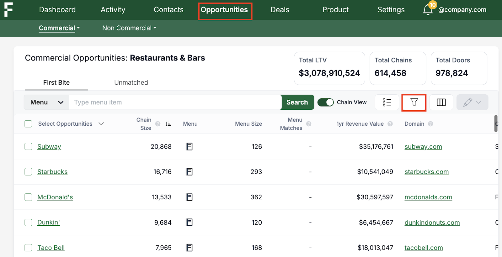 In this article, we’ll discuss how to use First Bite’s filters and menu searches to help segment opportunities and find the best-fit targets.